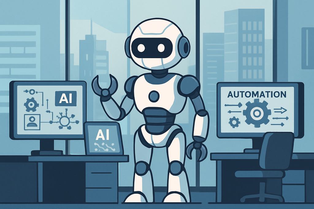 這張圖片展示了一個現代化辦公室內的人工智能自動化機器手臂,背景有顯示增長趨勢的圖表,突顯出人工智慧在網站經營與設計中的應用。