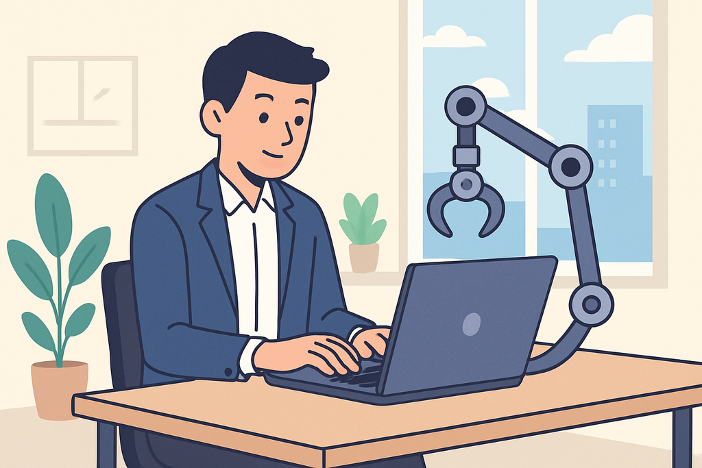 這張圖片展示了一個機器手臂與電腦鍵盤的工作場景,突顯人工智慧在網站架設和網頁設計中的應用,環境簡約,背後有綠色植物增加生氣。