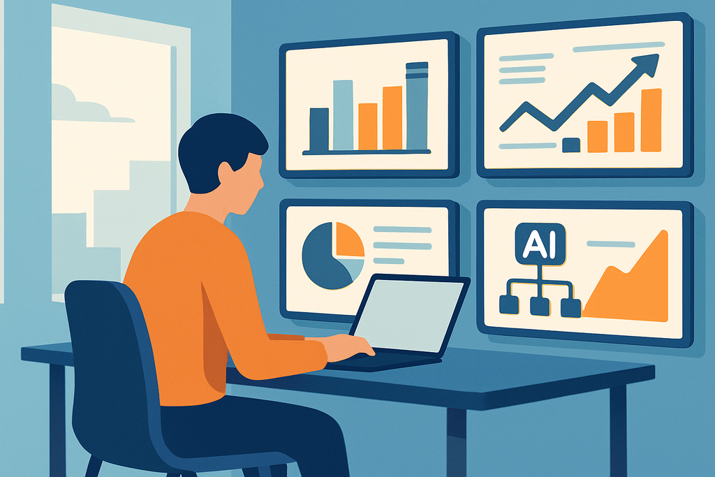 ▲ 這位女性在辦公桌前操作筆電,螢幕顯示機器人與雲端架構圖示,反映人工智慧如何驅動網站經營與數位轉型的創新實測驗證,凸顯私有部署能提升品牌運營效率的趨勢。